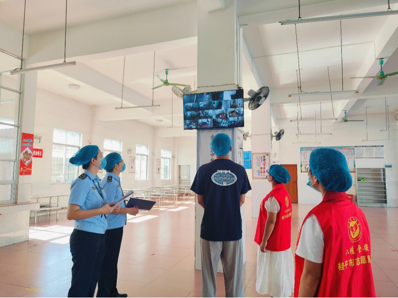 取此同时,由桂平市市场监管局法律人员、家长代表、“八桂食安”意愿办事者构成的“突击”查抄组,正在校方下一同走进学校食堂内部开展“随机查餐厅”勾当,同查共检当日校园餐平安环境。